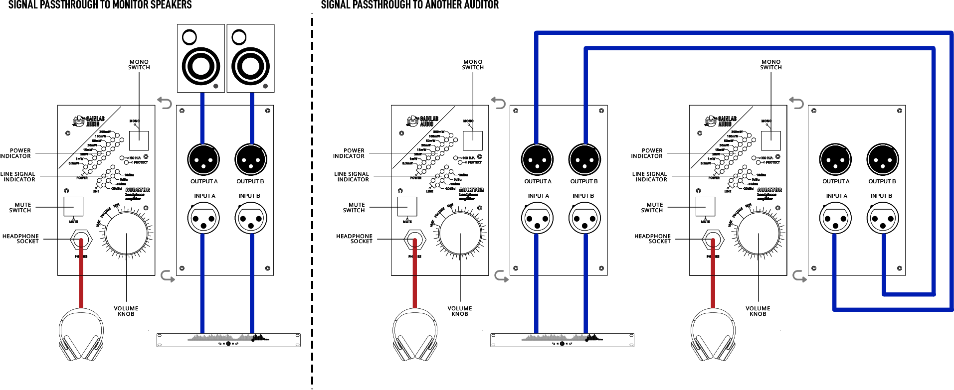 The Auditor is designed to process line-level signals received via the rear input connectors of a standard 500-series chassis and deliver them to its headphone output. In addition, it passes the signal through to the rear output connectors of the standard 500-series chassis for further processing. This way, it can effectively drive a pair of monitor speakers or additional Auditor headphone amplifiers.