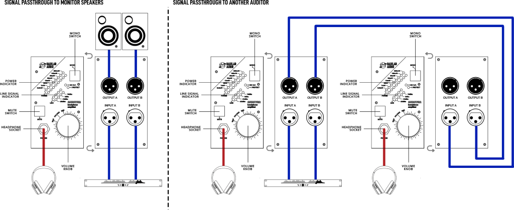 The Auditor is designed to process line-level signals received via the rear input connectors of a standard 500-series chassis and deliver them to its headphone output. In addition, it passes the signal through to the rear output connectors of the standard 500-series chassis for further processing. This way, it can effectively drive a pair of monitor speakers or additional Auditor headphone amplifiers.